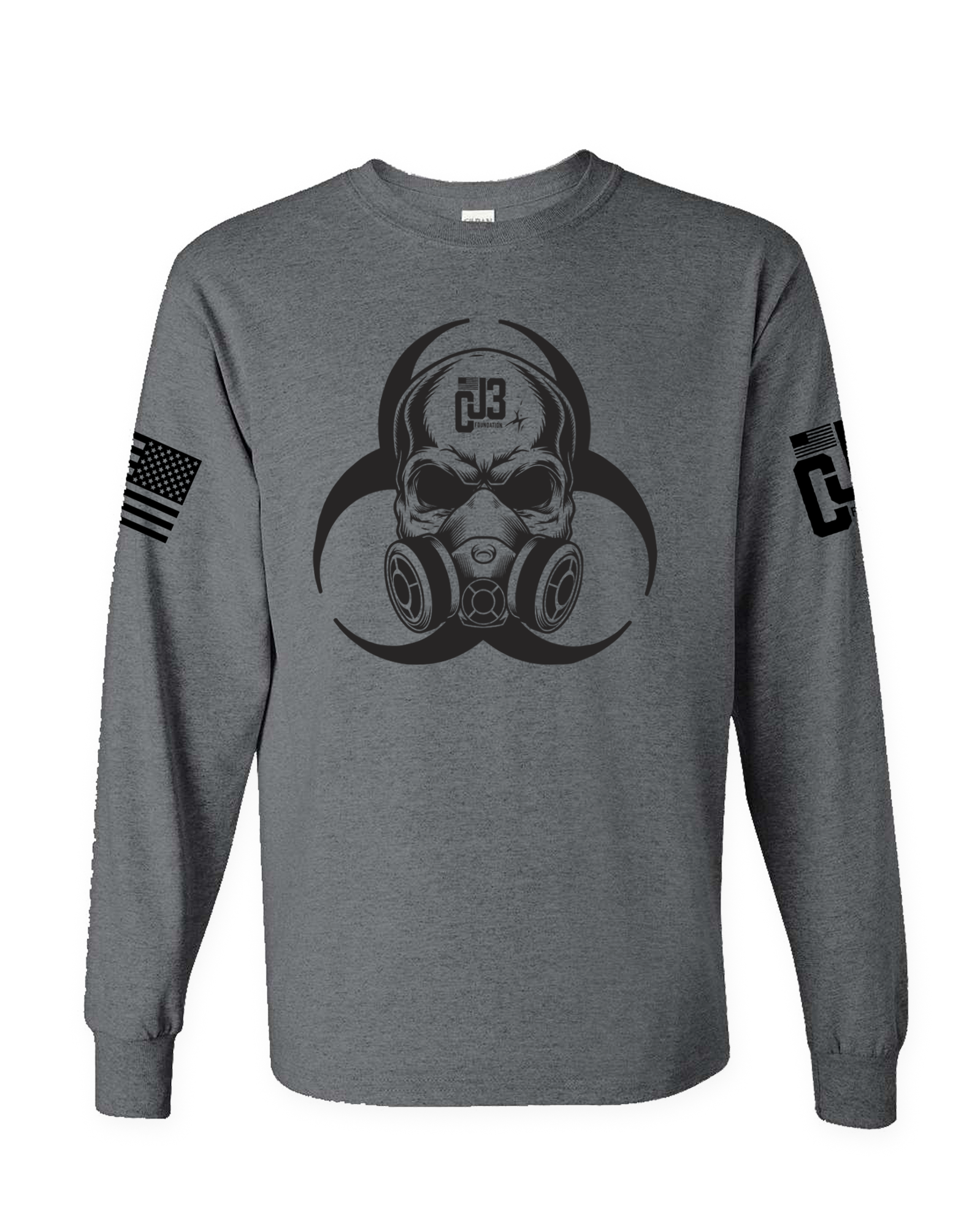 This is the CJ3 “Gas Mask” long sleeve shirt! On the front of the shirt is a skull with a CJ3 Foundation logo emblazoned on its head donning a gas mask with the biohazard logo behind it. This shirt is representative of a couple of major events that went on when it was being designed. First, our Nation was in the throes of COVID. So it is a tactical representation of the masked reaction to an outbreak that put a hurting on and took a toll on the heroes we serve. Second, our military members who deployed were dealing with the fight for our government to acknowledge and treat the injuries and illnesses caused by the “burn pits” many of us were exposed to while deployed in service to this great Nation. And third, the design just looks tacti-cool!