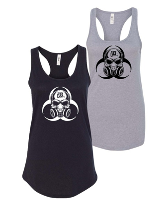This is the CJ3 “Gas Mask” Tank! On the front of the shirt is a skull with a CJ3 Foundation logo emblazoned on its head donning a gas mask with the biohazard logo behind it. This tank is representative of a couple of major events that went on when it was being designed.