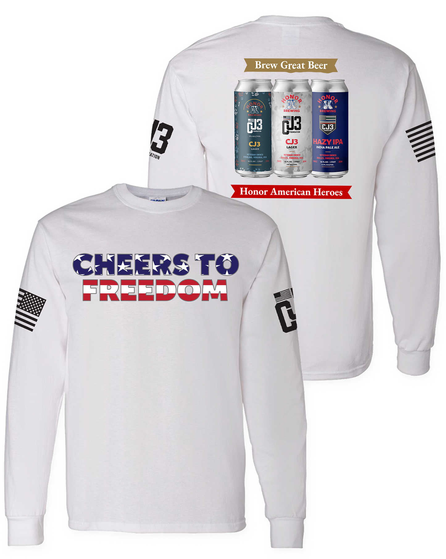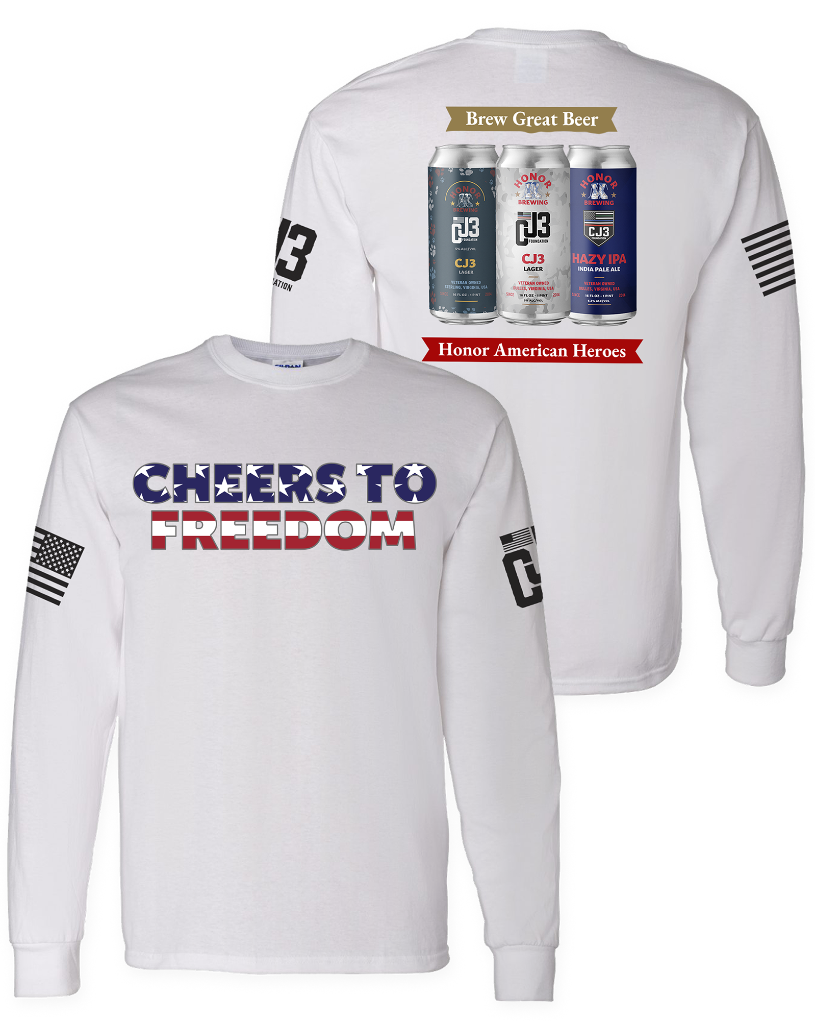 The new CJ3 Foundation/Honor Brewing Company shirt features the three (3) CJ3 Beer cans developed and released by Honor Brewing Company along with the words "Brew Great Beer" and “Honor American Heroes” on the back. A very patriotic “Cheers To Freedom” is on the front, while the CJ3 Foundation logo and subdued American Flag are on the sleeves.