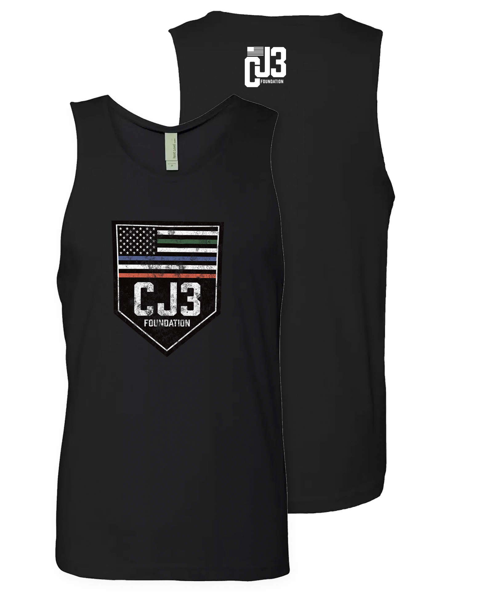 The CJ3 Foundation “LOGO” shirt is our flagship design! The front of the shirt depicts the CJ3 Foundation shield showing the “American Flag” with one green stripe to represent US Military, one blue stripe to represent Law Enforcement, and one red stripe to represent Firefighters and First Responders. Below the flag, you’ll find: CJ3 FOUNDATION “C” (Combined), “J” (Joint), “3” (Operations), “Foundation” A 501(c)(3) nonprofit charity organization. The back of our CJ3 “Logo” shirt depicts an American Flag with the images that demonstrate our initiatives and the words representing our mission: “Serving Our Nation’s Wounded Heroes”.