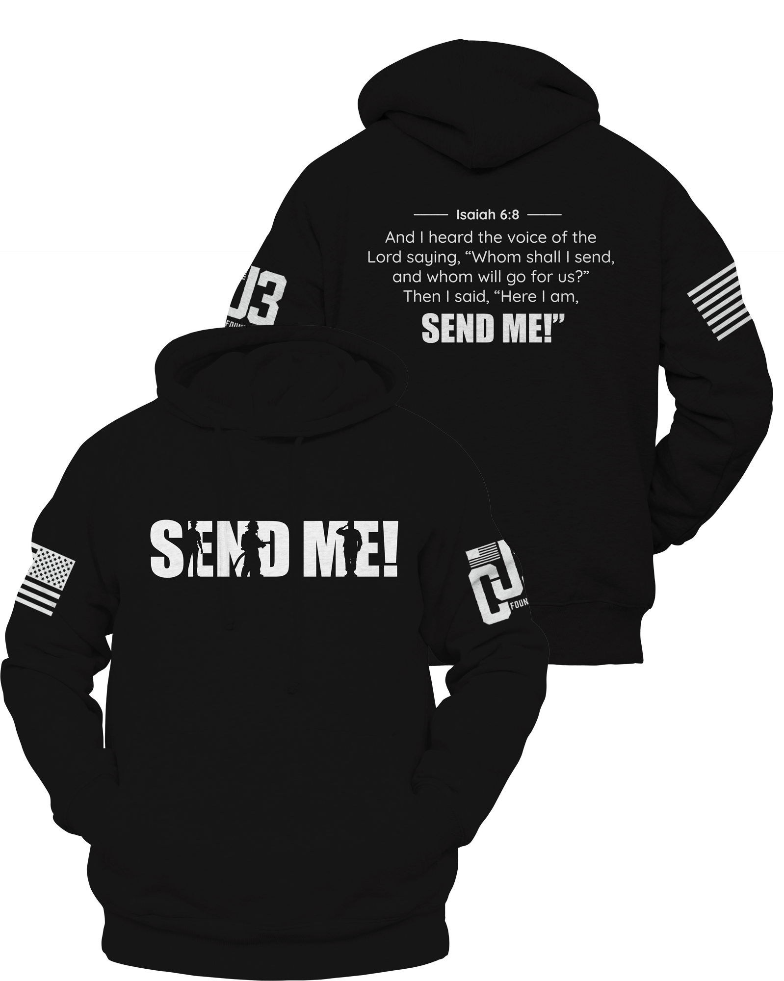 This is the CJ3 “SEND ME” shirt! At the CJ3 Foundation, we proudly stand for five patriotic “Fs” - Faith, Family, Flag, Freedom, and Firearms. Pertaining to Faith, throughout CJ3 Actual’s career, one of his guiding Bible verses has been Isaiah 6:8 – “Then I heard the voice of the Lord saying: ‘Whom shall I send? Who will go for Us?’ And I said: ‘Here am I. Send me!’” This verse is representative of all of the Heroes the CJ3 Foundation serves. They all signed the dotted line and swore an oath to put their lives on the line for this great Nation. Each one raised their right hand and in essence said “SEND ME”! This shirt honors these Heroes.
