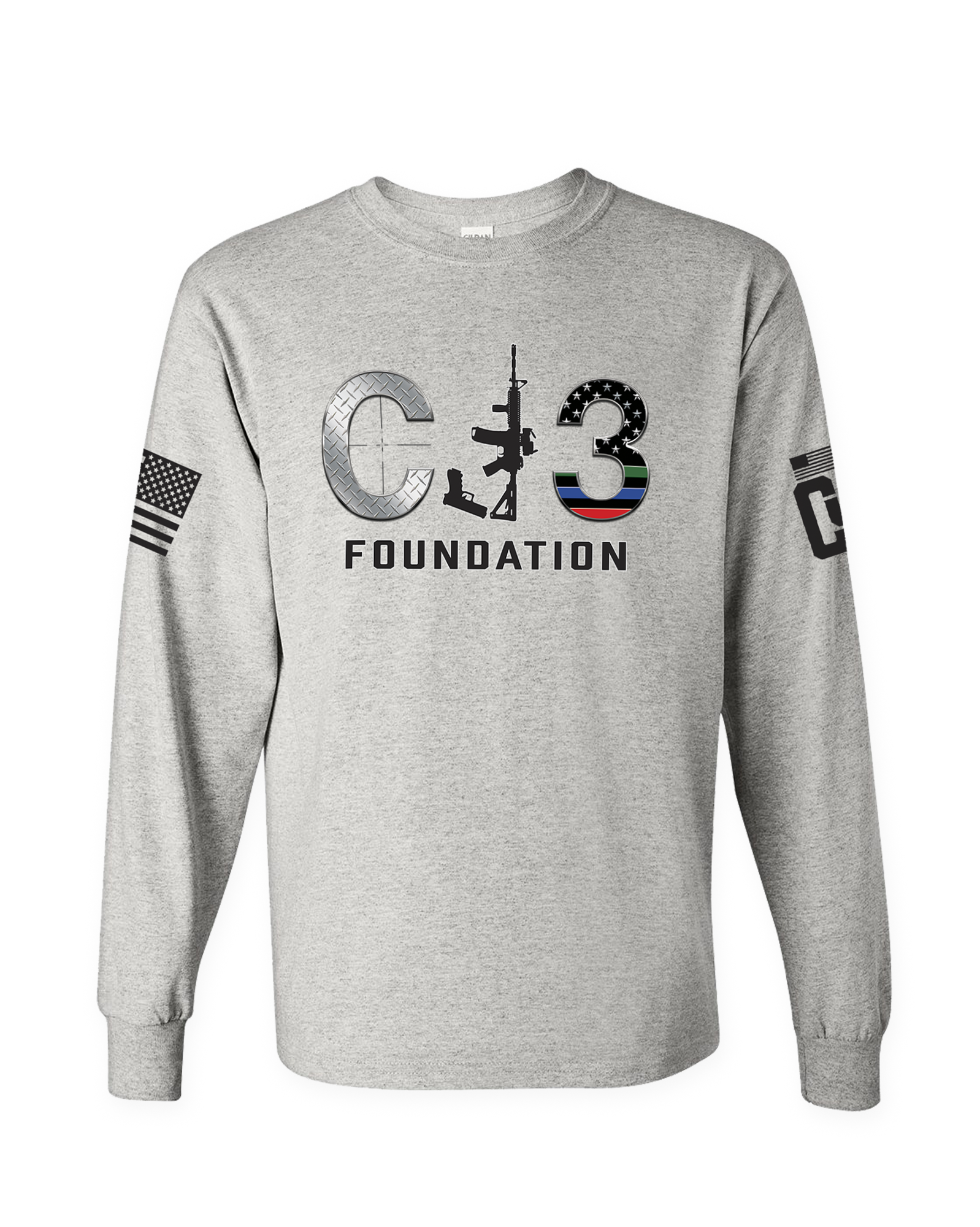 This is the CJ3 “Weapons” long sleeve shirt! On the front of the shirt is the word CJ3 Foundation - “C” (Combined) - The CJ3 Foundation enlists and incorporates a network of support and services from multiple partner agencies and organizations (federal, state, and local governments; private and commercial sectors; charity and advocacy groups) to provide combined and unified assistance to those in need. The "C" is diamond plated and has a rifle reticle in the center of it. “J” (Joint) - In the military, ‘J’ represents activities, operations, and organizations in which multiple elements participate. Hence, it represents the diverse group the CJ3 Foundation supports…our wounded U.S. Military Service Members/Veterans, Law Enforcement, Firefighters, and Emergency/First Responders. The "J" is represented by a standing rifle with a handgun forming the bottom curve of the letter. “3” (Operations) - In the military, the ‘3 Shop’ denotes support, planning, coordination, and operations. The CJ3 Foundation embraces this ‘3 Shop’ concept as it is representative of our role when providing services, support, and advocacy to those in need. The "3" is colored with our CJ3 American flag design; a field of stars, one green stripe to represent US Military, one blue stripe to represent Law Enforcement, and one red stripe to represent Firefighters and First Responders. “Foundation” - A 501(c)(3) nonprofit public charity organization engaging in charitable activities. Below the letters CJ3 is the word "FOUNDATION" in our typical font.